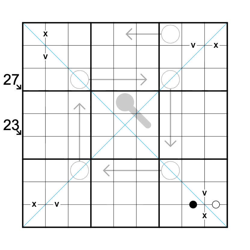 XV: Cells separated with a V must sum to 5. Cells separated with an X must sum to 10.