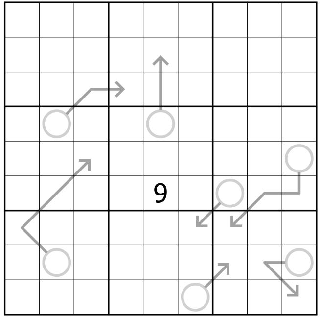 Each arrow defines a hidden renban line. The line is of length equal to the digit in the arrow's bulb, and the shape of the line serves as straight extensions to one or both lines forming the arrow's tip, and these segments do not pass the arrows tip.