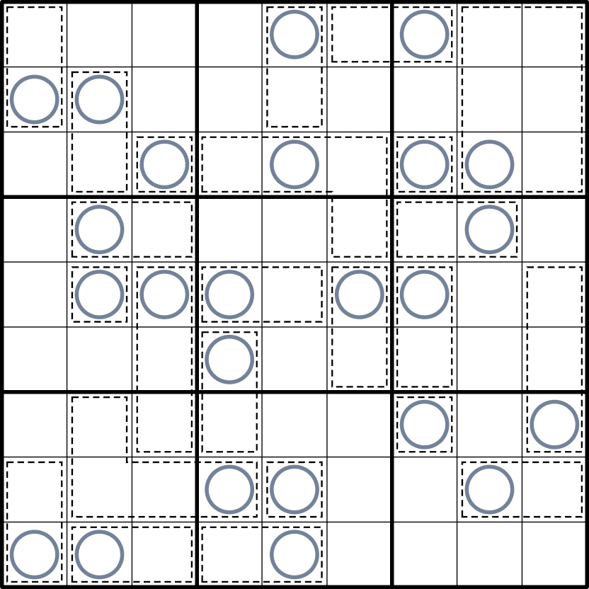 - Counting Cages: Digits do not repeat in cages. Each cage has a circled digit, indicating how many cages have the same sum as that cage. For example, if a cage sums to 12 and has a circled 5, there are exactly 5 cages in the puzzle which sum to 12.