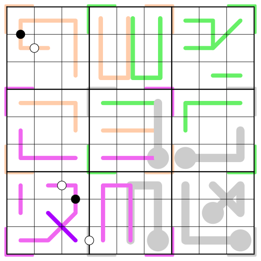 – Each QQ contains four 3x3 square regions that each contain the numbers 1-9, without repeating within a row or column of the 6x6 area that this QQ occupies. Digits may repeat within a full nine cell row or column of the grid so long as each QQ is valid.