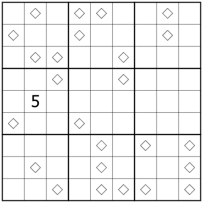 Draw a loop (using orthogonal line segments through the centers of cells) such that it visits every cell marked with a diamond. The loop may cross itself, but can only change direction (turn through 90 degrees) at a diamond. Thus, all "corners" of the loop are on diamonds. However, not all diamonds mark loop corners -- "non-corner" diamonds lay on a line segment _between_ two corners.