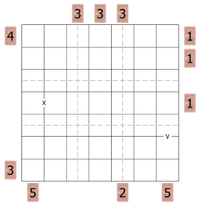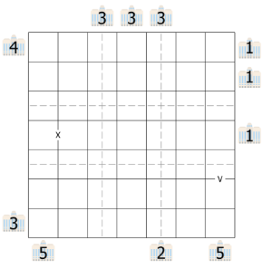 The same clues, on a squishdoku, but the clues work as either numbered rooms or skyscraper clues. Thanks to all the testers!