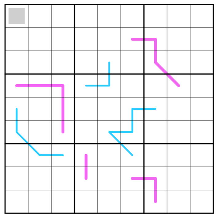 The 3x3 box borders divide each blue line into segments with the same sum.