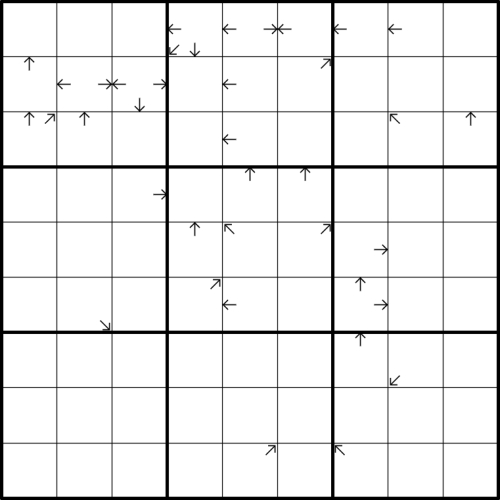 Rules: Normal Sudoku rules apply. For each arrow separately, all cells in arrow direction sum to a multiple of the arrow cell.