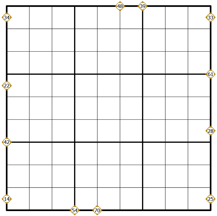 Sum Dots: Numbers in cells (inside or outside the grid) touching a gold sum dot sum to the indicated total. Numbers may repeat if allowed by other rules. All cells outside the grid that are touched by a sum dot are X-sum clues.