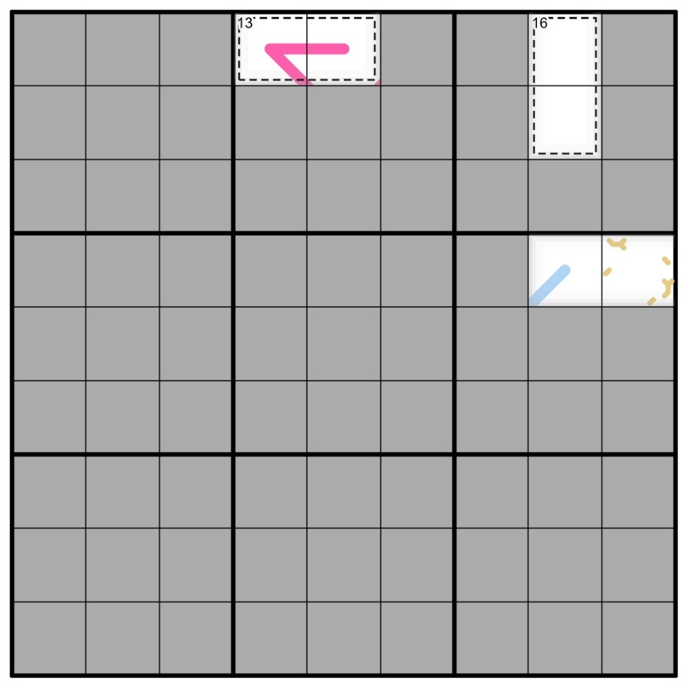 Additionally you have to build your own between lines by matching clues (footprints to footprints, cookie crumbles to cookie crumbles etc). The clues act as the circled endpoints of a between line. All such lines must be connected by choosing the shortest possible orthogonally connected path that does not share any cells with any other line, including the German whisper lines. Digits along a between line must be between the digits on the circled ends of the line.