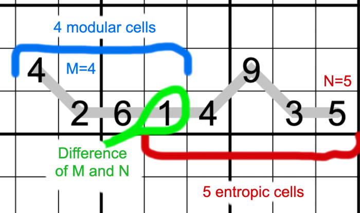 The digit N at one end of the line means that the line proceeds N cells from that end as an Entropic line, and the digit M at the other end of the line means that the line proceeds M cells from that end as a Modular line. The digit in the cell in which both of these modes meet is the difference between N and M.