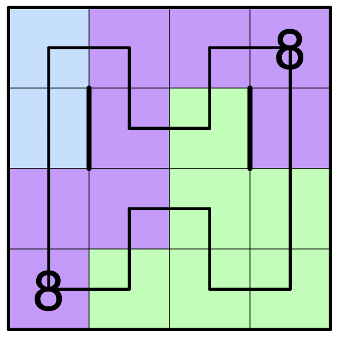 • Closed Borders: Each thick edge is a Closed Border. The Simple Loop cannot intersect a Closed Border, and a single Fillomino Region cannot take both of the cells adjacent to a Closed Border.