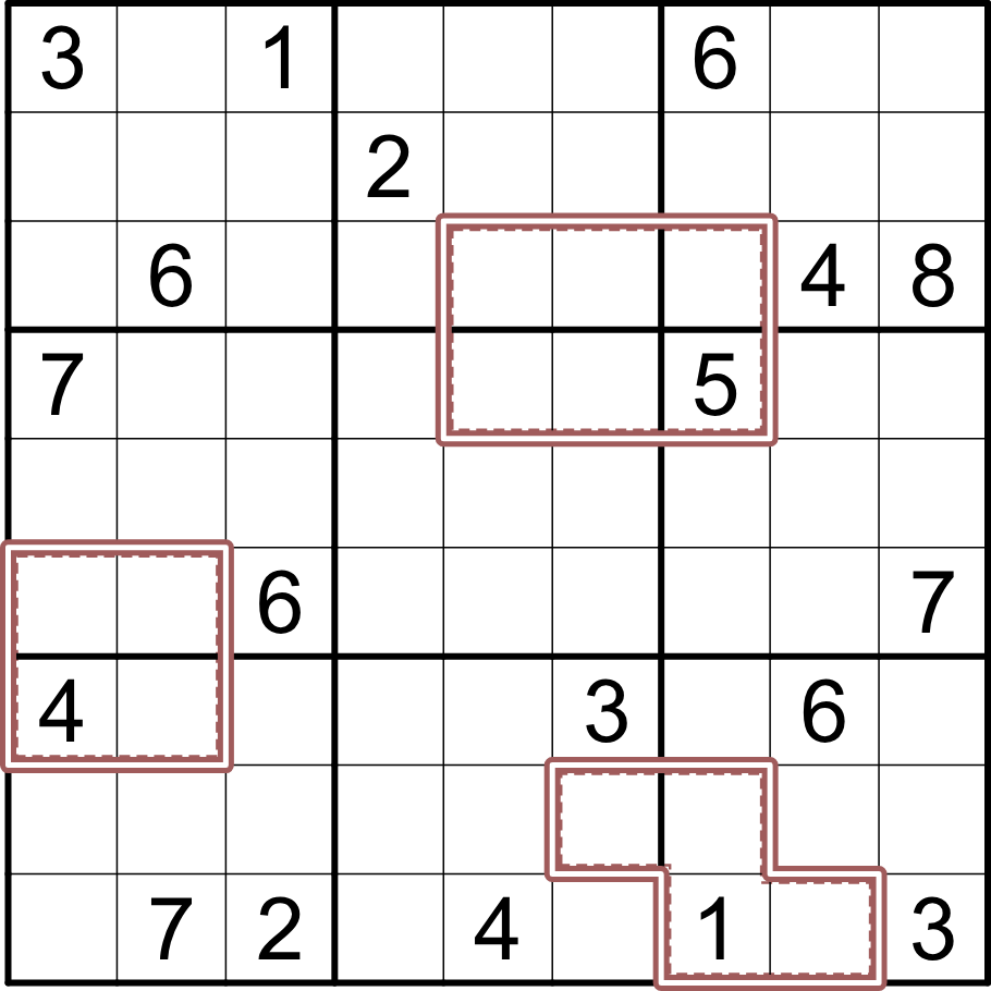 - Hundred Acres - the digits inside a brown cage must multiply to a value of 100. Digits may repeat if allowed by other rules. Additionally, digits orthogonally adjacent to the cage must be a different entropy (low [1,2,3], medium [4,5,6], or high [7,8,9]) than their orthogonal neighbor within the cage.
