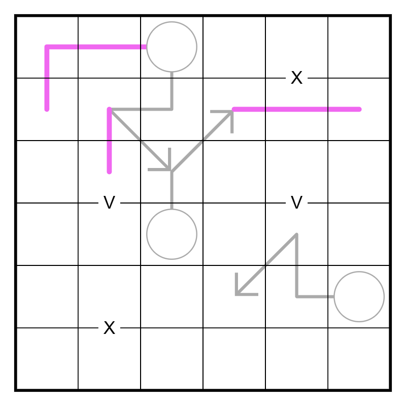 - All dominoes in the 6x6 summing to a multiple of 5 are given. Cells separated by an X sum to 10 and cells separated by a V sum to 5.