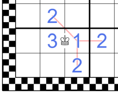 For example, in the image below, the King lies between a 3 (G) and a 1 (S), with a difference of 2 (D). Therefore, the digit 2 is placed in 3 cells a King's move away from the 1.