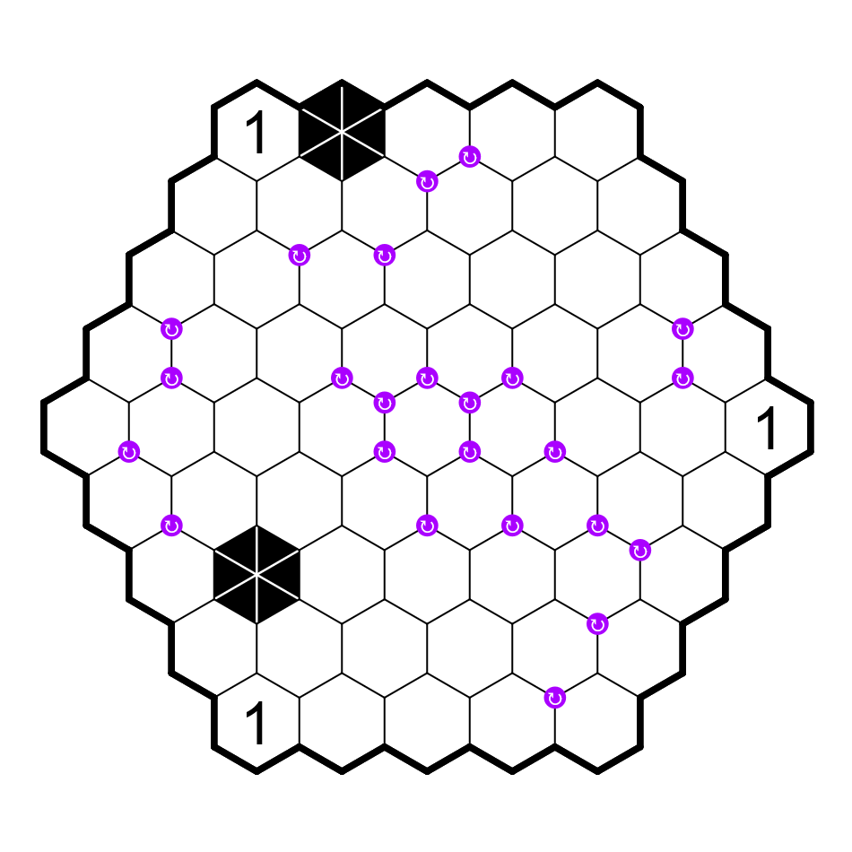 • A purple dot on a vertex means that the three digits touching that vertex: 1) all have different remainders when divided by three, and also 2) form a three-cell "thermometer" that runs clockwise around the dot, the start and end points of which must be deduced (digits on this thermometer must strictly increase along it).