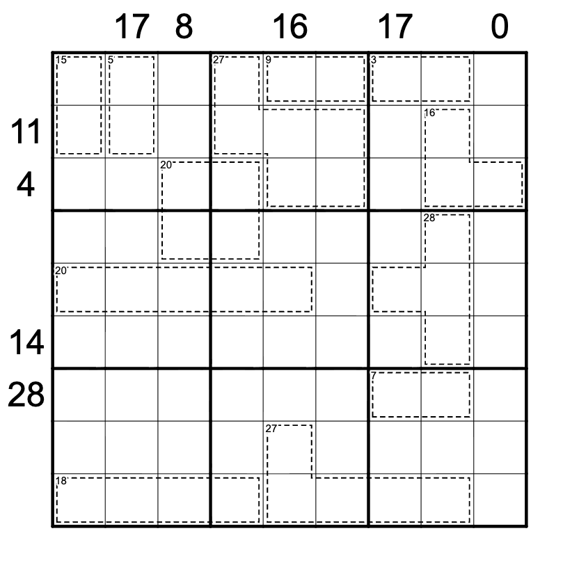A clue outside the grid indicates the sum of the digits between the 1 and the 9 in that row or column.
