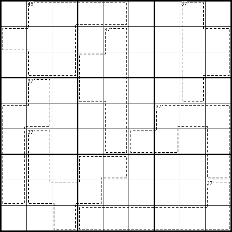 Place the digits 0-9 without repeating in any row, column, and box. 0 must appear in every box, but never in a cage. Since there are ten possible digits, each box will miss one digit. There are an equal number of low, medium, and high digits missing from the grid.