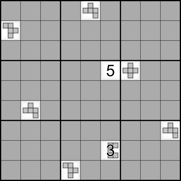 The five cells of the Pentomic Renban Set defined by each Exploding Pentomino occupy the same position in each 3x3 box.