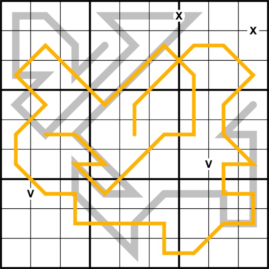 Orange line is a regional sum difference line where each segment of the line divided by box edges sums to a different number. The total sum of the orange line is 171.
