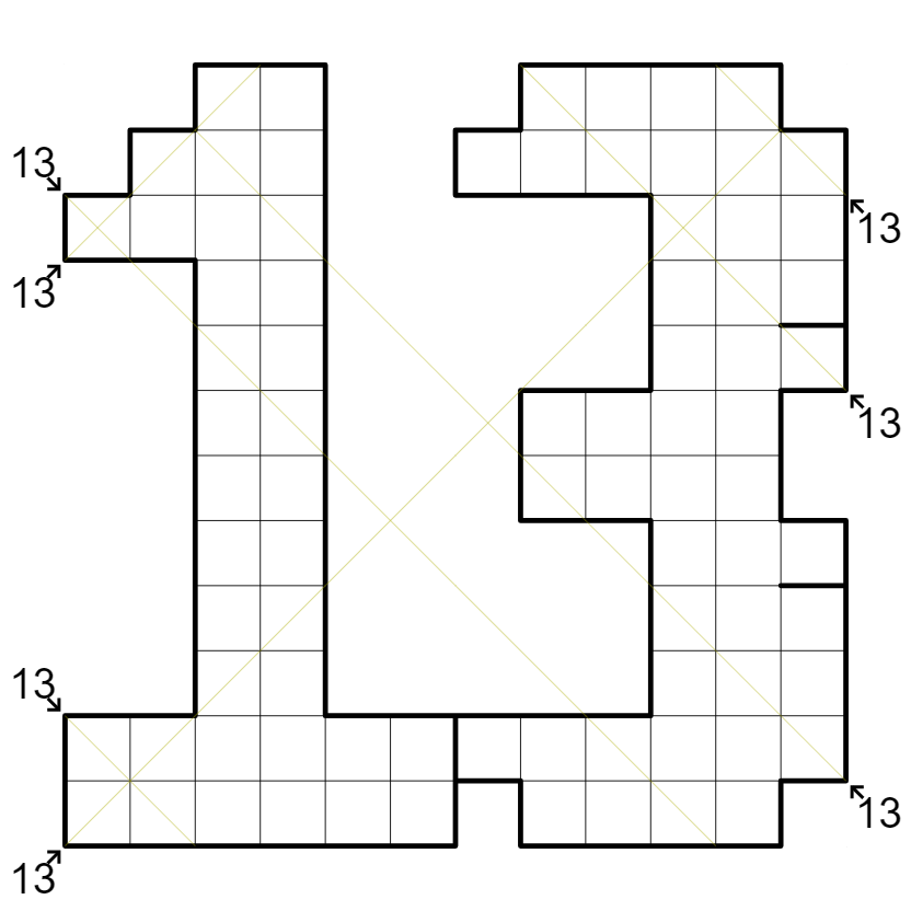 • In this puzzle, cells outside the large "13" shape are to be left empty.