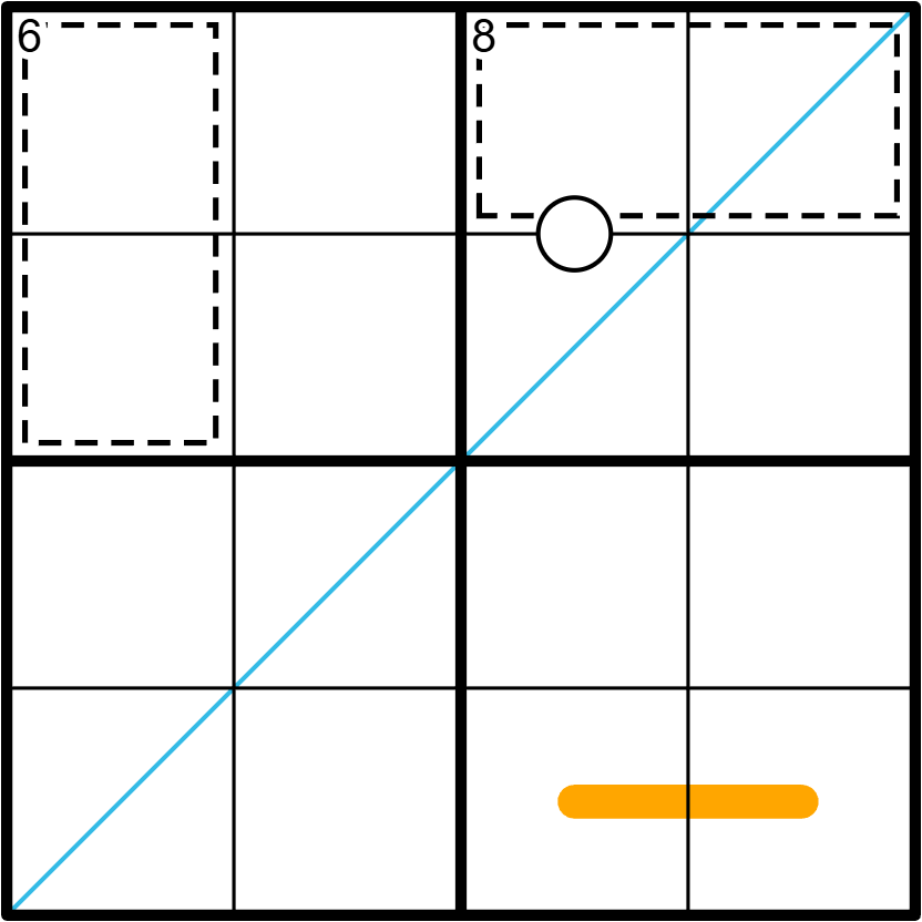 • Kropki Dots: A black dot separates two cells with a 1:2 ratio between them. Not every dot is necessarily given.
