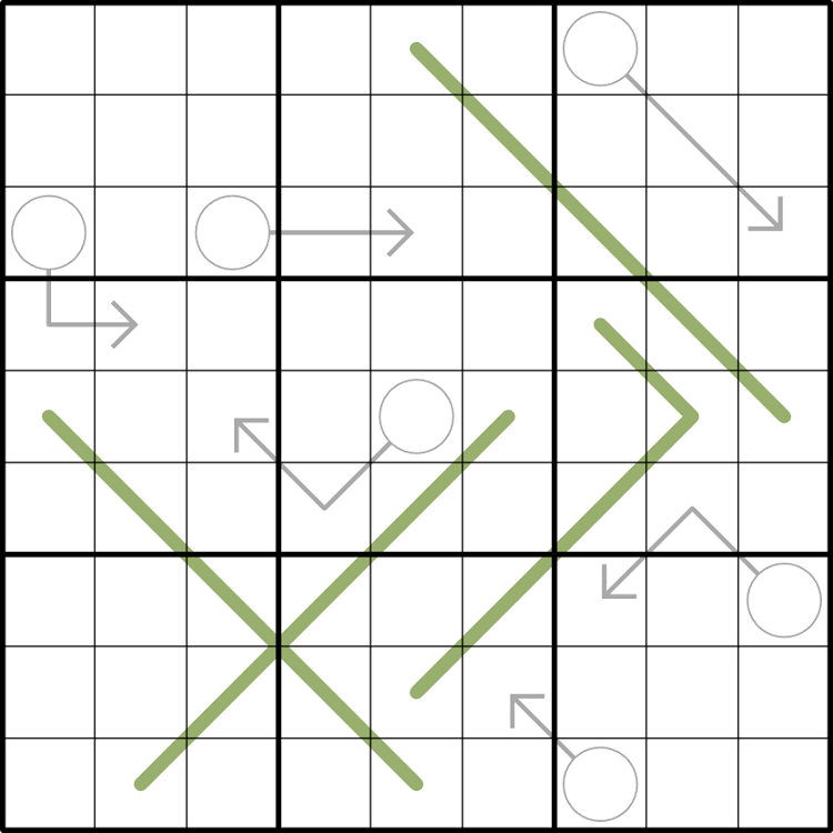 - Arrows: The digits along each arrow must sum to the digit in the circled cell. Digits may repeat along an arrow if permitted by other rules.