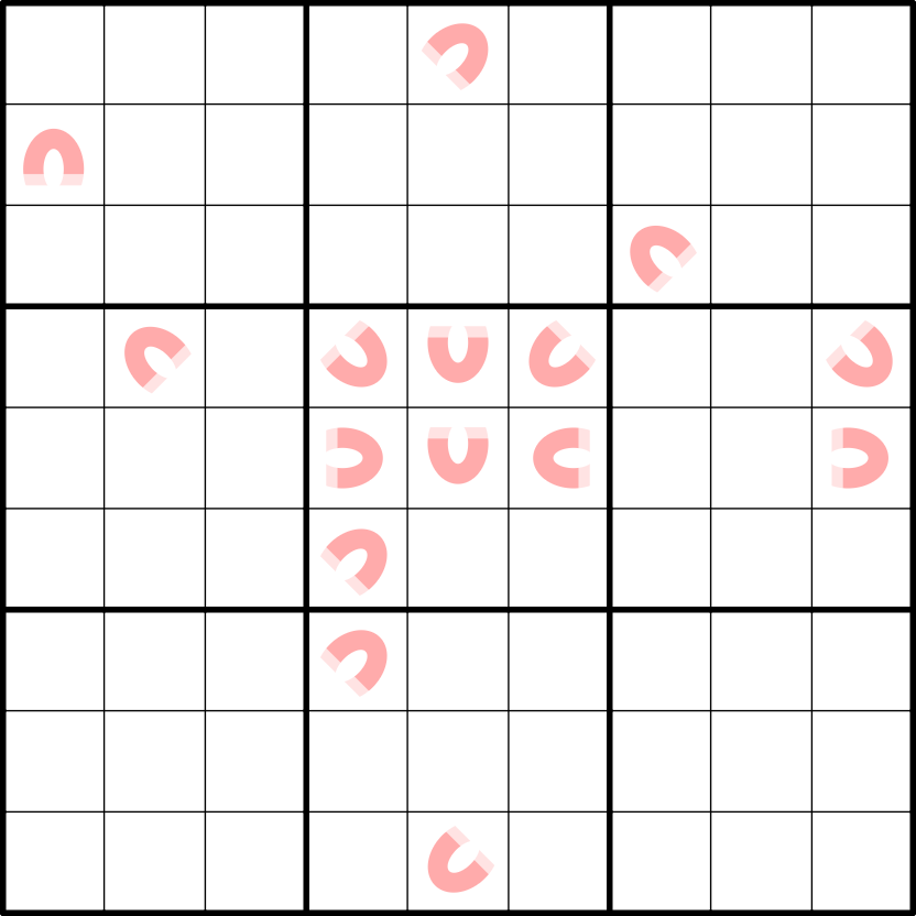 - Magnets: A digit in a magnet cell (M) is the sum of all digits seen in the indicated direction up to the first cell seen that contains a digit larger than M.