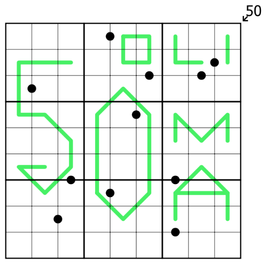 Fun fact: You could ignore the 50 diagonal or all the black dots without losing the unique solution.