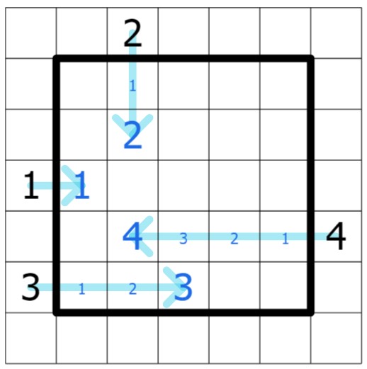All grey cells outside the grid must be filled with a digit. A digit outside the grid (N) must appear in the Nth cell from the corresponding cell's border. (ex. a 1 outside the grid means that a 1 is placed in the 1st cell inside the corresponding grid border.)