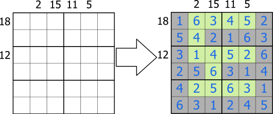 Numbers outside the grid are yin yang sandwich clues: they give the sum of the digits in unshaded cells in that row or column that are between the outermost shaded cells of the row/column. Note that there will always be at least two shaded cells in every row/column that contains a clue.