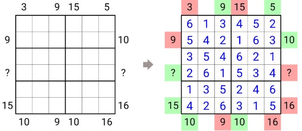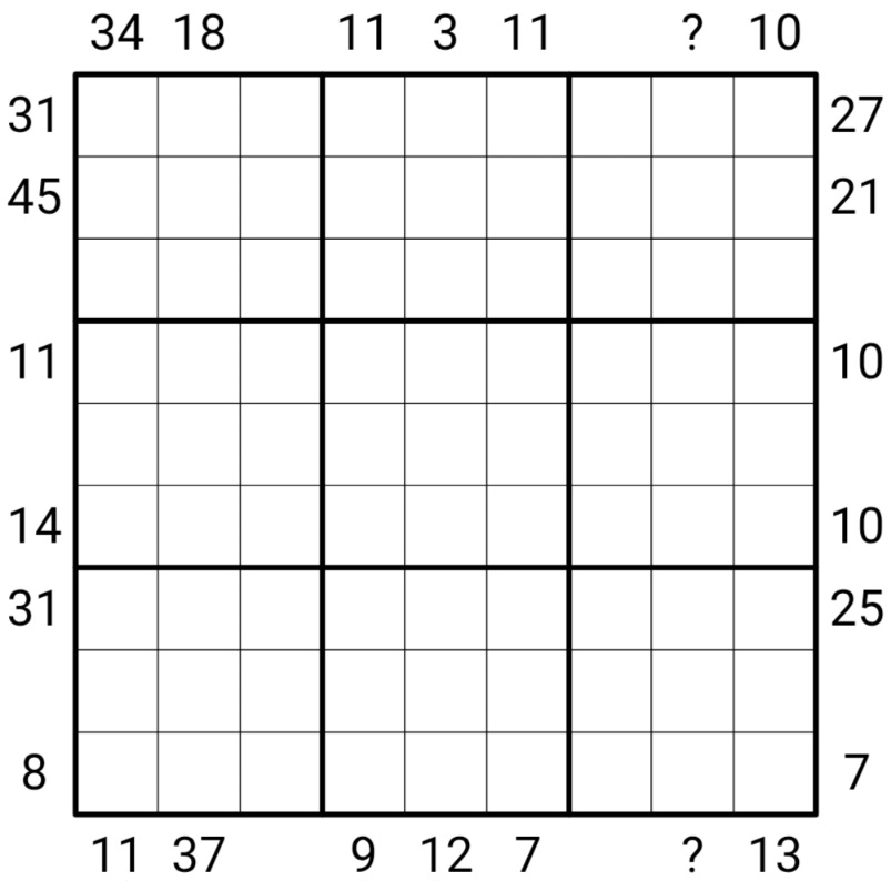 - X-Sums : Clues outside the grid represent the total of the first X digits in that direction, with X being the digit in the first seen cell. A "?" is a stand in for any digit 1-9.