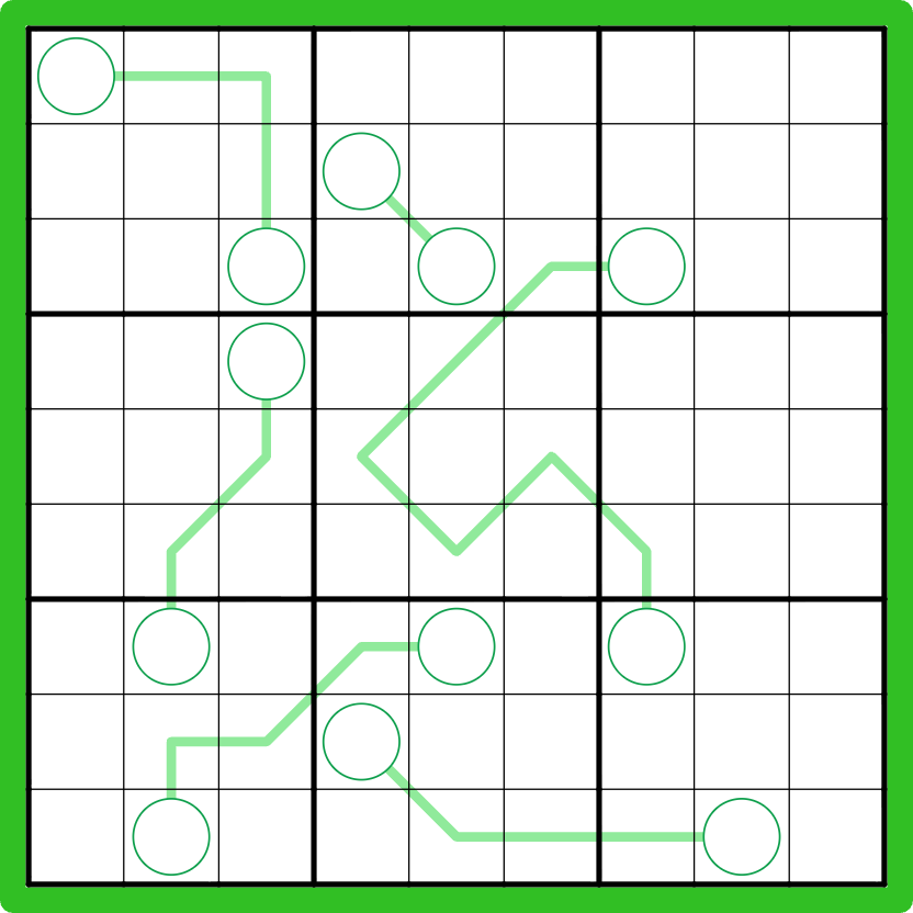 Extra-region construction: There are nine, 9-cell, non-overlapping orthogonally connected extra regions in the grid that each contain the digits 1-9. Extra regions must be also be orthogonally connected within a 3x3 box. Digits in a bulb indicate how many cells in that 3x3 box are part of the region that it occupies. Bulbs may or may not share the same extra region, but the line connecting them must never contain cells of the same extra region as either of the connected bulbs.
