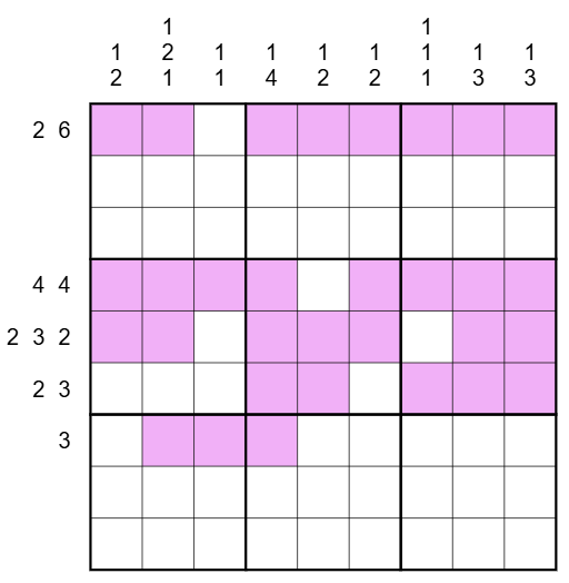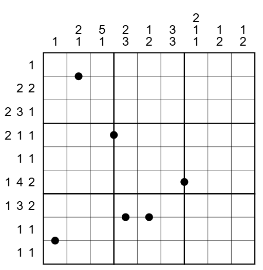 Nonogram: The numbers outside the grid define a nonogram. Shade the cells in the grid so that the pattern of shaded cells matches the numbers given for each row and column. See the example of a solved nonogram below. A digit in a shaded cell must see the same digit a king’s move away at least once. All shaded cells are given; that is, a negative constraint applies.