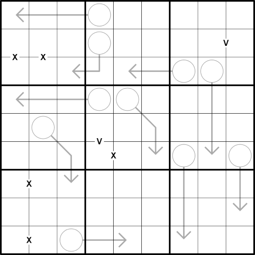 • Cells connected by an X must sum to 10. Cells connected by a V must sum to 5. Not all Xs and Vs are given.