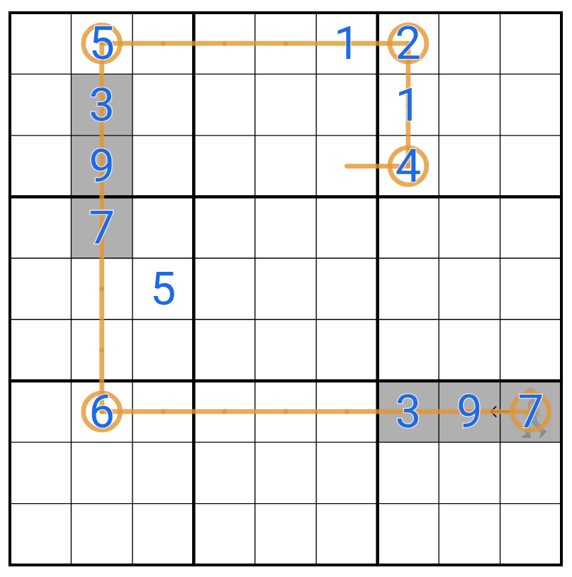 Breadcrumbs: On any path segment that has two or more cells between stops (i.e. makes three or more steps), these in-between cells must include two adjacent digits that sum to 10.