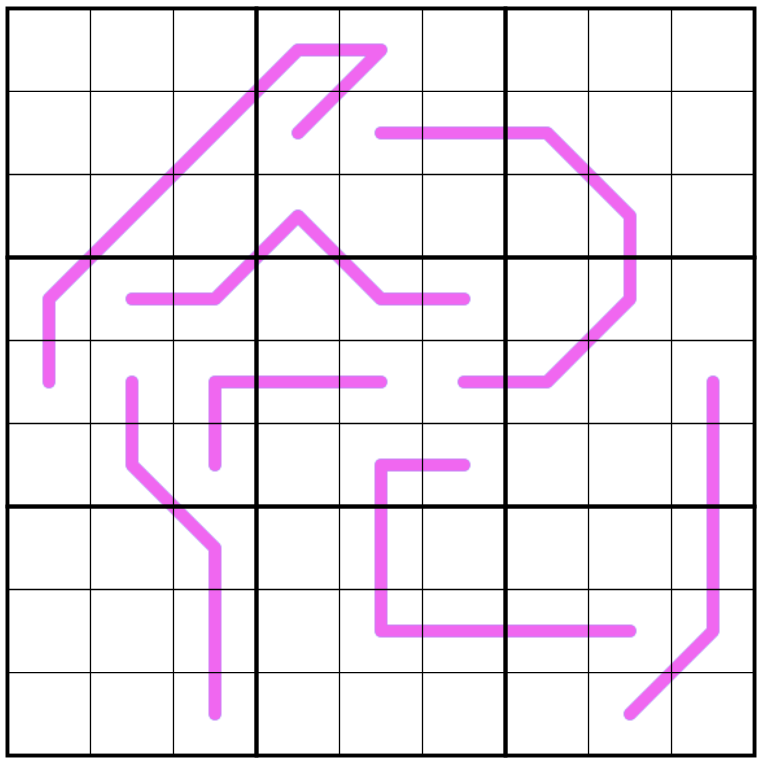 Normal Sudoku rules apply. Each pink lines forms a sequence of non-repeating, consecutive digits in any order. Box borders divide pink lines into segments with the same sum. Different lines may have different sums.