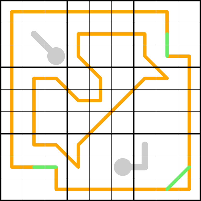 Dutch Whispers: Adjacent digits along an orange line must differ by at least 4.