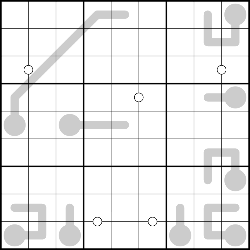 Kropki dots: Digits in cells joined by a white dot are consecutive.