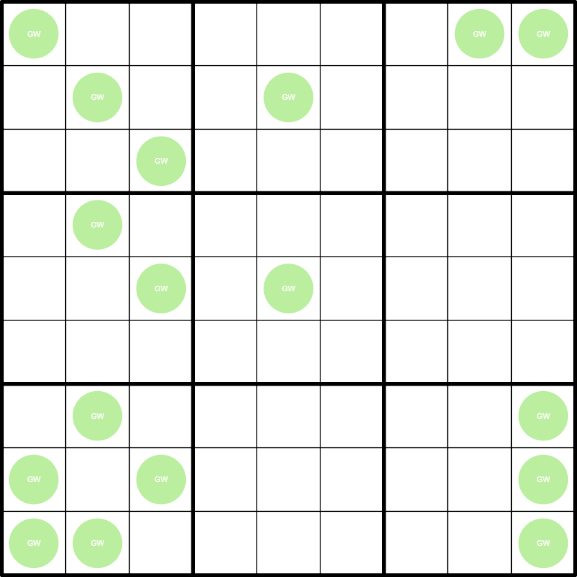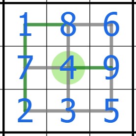 German Pairometer: A digit in a green circle indicates how many orthogonal pairs of digits with a difference of at least 5 exist within all its (up to 9) surrounding cells.