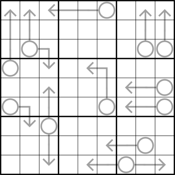 - Digits along an arrow must sum to the digit in the circle cell attached to that arrow.