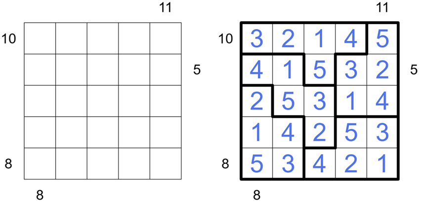 Clues outside of the grid give the sum of the digits that appear in the first group of cells seen from that direction in that row or column, ending at the first region boundary.