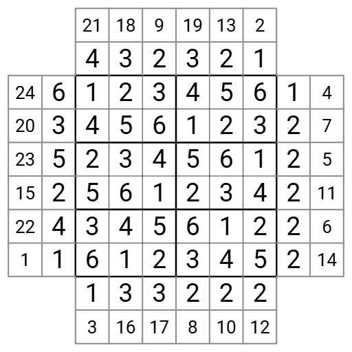 - Skyscraper Clues (Inner Layer): The clues immediately outside the 6x6 grid are Skyscraper clues. Each digit in the grid represents a building of that height. A skyscraper clue indicates the number of buildings visible from that direction, where taller buildings obscure shorter ones.
