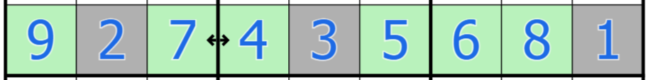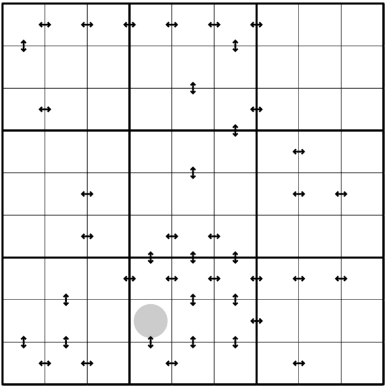 Janus Arrows: A double arrow clue looks out in both directions from its edge. Larger cells block its vision of smaller cells, so it only sees a cell if that cell is larger than every other cell between itself and the arrow. Double-arrow clues will see twice as many cells in one direction as they will in the other.