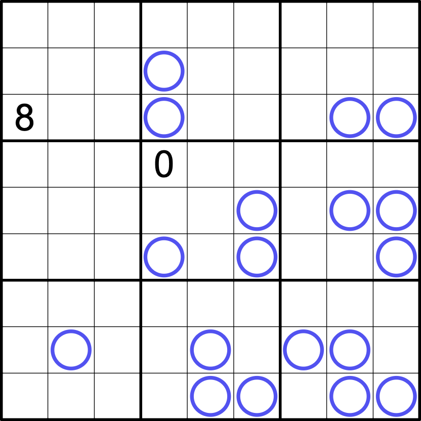 NEARLY normal sudoku rules apply. Place the digits 0-8 once each in every row, column, and 3x3 box.