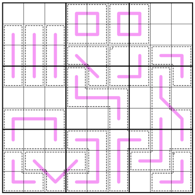 Digits in cages do not repeat, and sum to the small clue, if given.