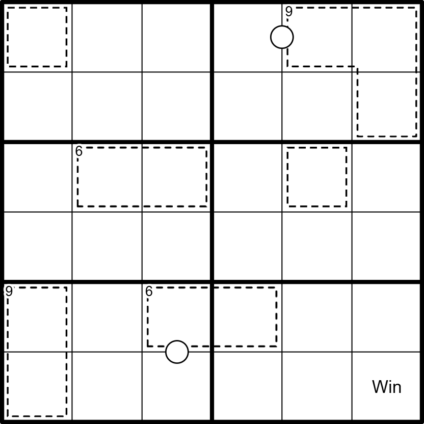 Setup: At the start, a coin is placed on an initial cell. This cell cannot be inside a cage and cannot be the "Win" cell (the bottom-right cell).