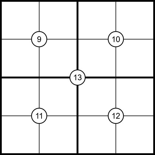 Mathrax: Each pair of diagonally opposite digits surrounding a circle must sum to the value given.