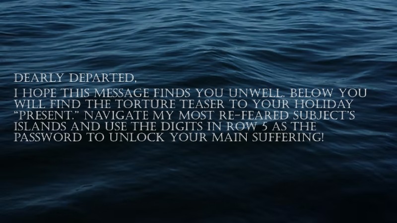 This was set as Niverio's Secret Satan Gift 2025, part 1. Be sure to check out part 2 of the gift. Thanks to everyone who helped make this event happen, particularly to Andrewsarchus, ThePedallingPianist, and OopyLoopy for testing/puzzle help! What I sent to Niv this year was the message below and two pdf files, one for each part. The images below are the pcitures from the first pdf.