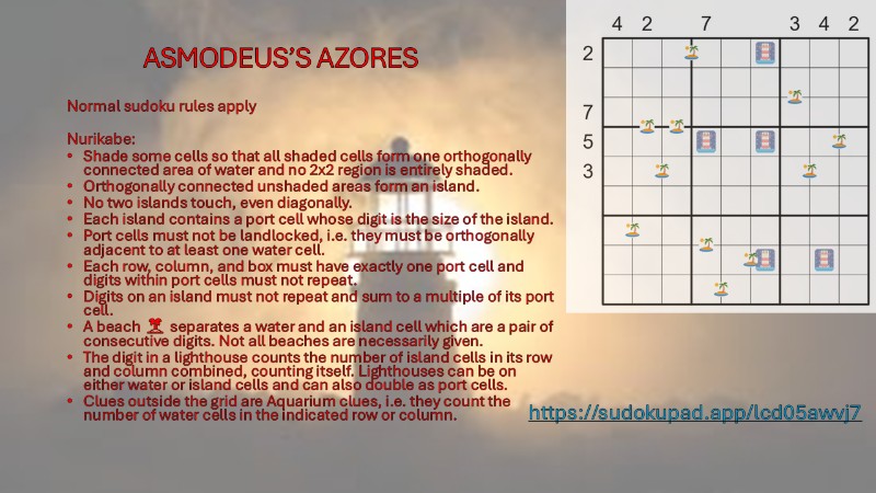 - Clues outside the grid are Aquarium clues, i.e. they count the number of water cells in the indicated row or column.