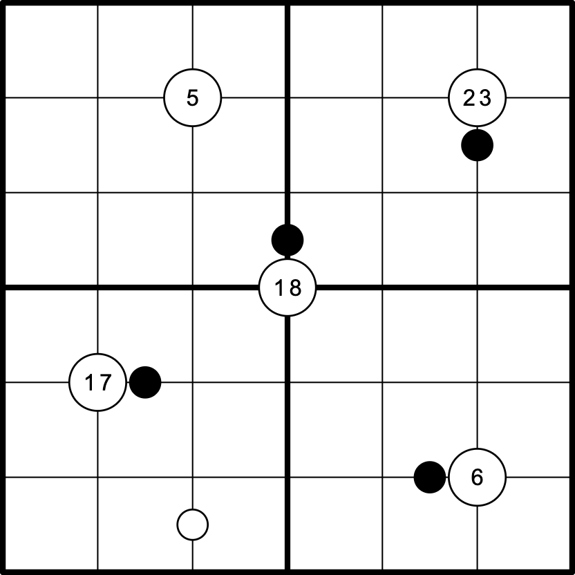 Kropki Dots: Digits separated by a white dot are consecutive. Digits separated by a black dot are in a 1:2 ratio. Not all dots are necessarily given.