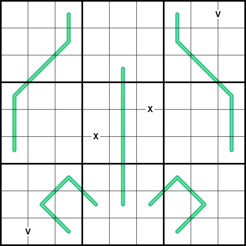 X/V: Digits in cells joined by an X sum to 10. Digits in cells joined by a V sum to 5. Not all Xs and Vs are necessarily given.