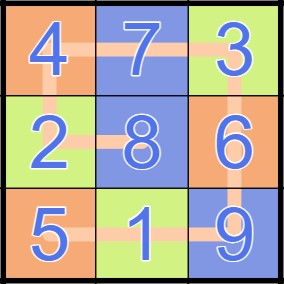 Entropic: Any sequence of 3 adjacent digits along a peach line must have a low digit (123), a medium digit (456) and a high digit (789). For lines shorter than 3 cells, each digit must belong to a different entropic group.