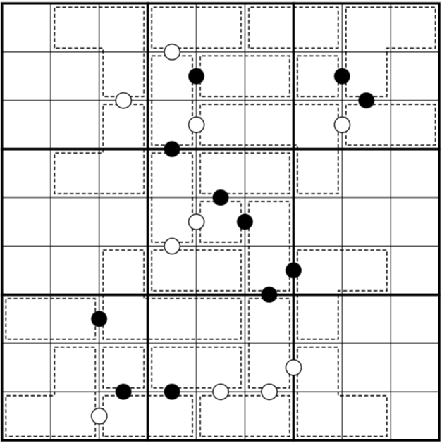 A white dot between two dotted outlined regions indicates that the sums within those regions have a difference of one. A black dot between two such regions indicates that one of the sums is twice the other sum. When there is no dot between two regions, they cannot have sums that differ by one or are double. Digits may not be repeated in regions.